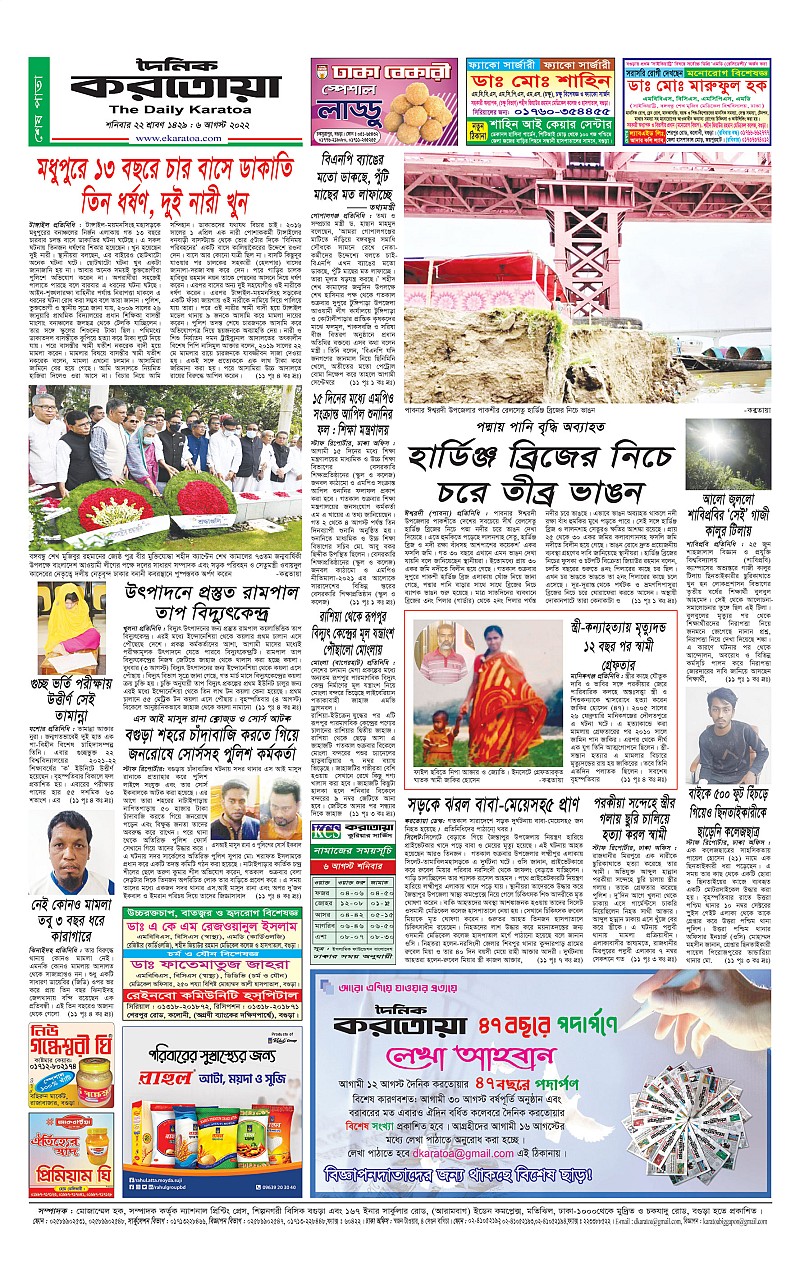 ঢাকা ও বগুড়া শনিবার, ০৬ আগষ্ট ২০২২