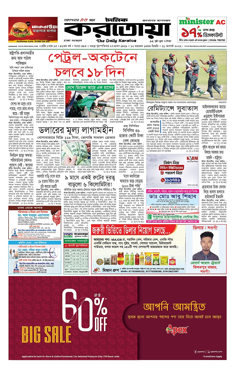 ঢাকা ও বগুড়া বৃহস্পতিবার, ১১ আগষ্ট ২০২২